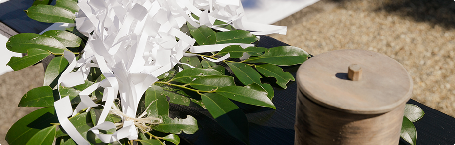 一般的には紅白水引の「のし袋」に「御祈祷料」あるいは「玉串料」とお書きいただければ結構です。下に例を挙げておきます。